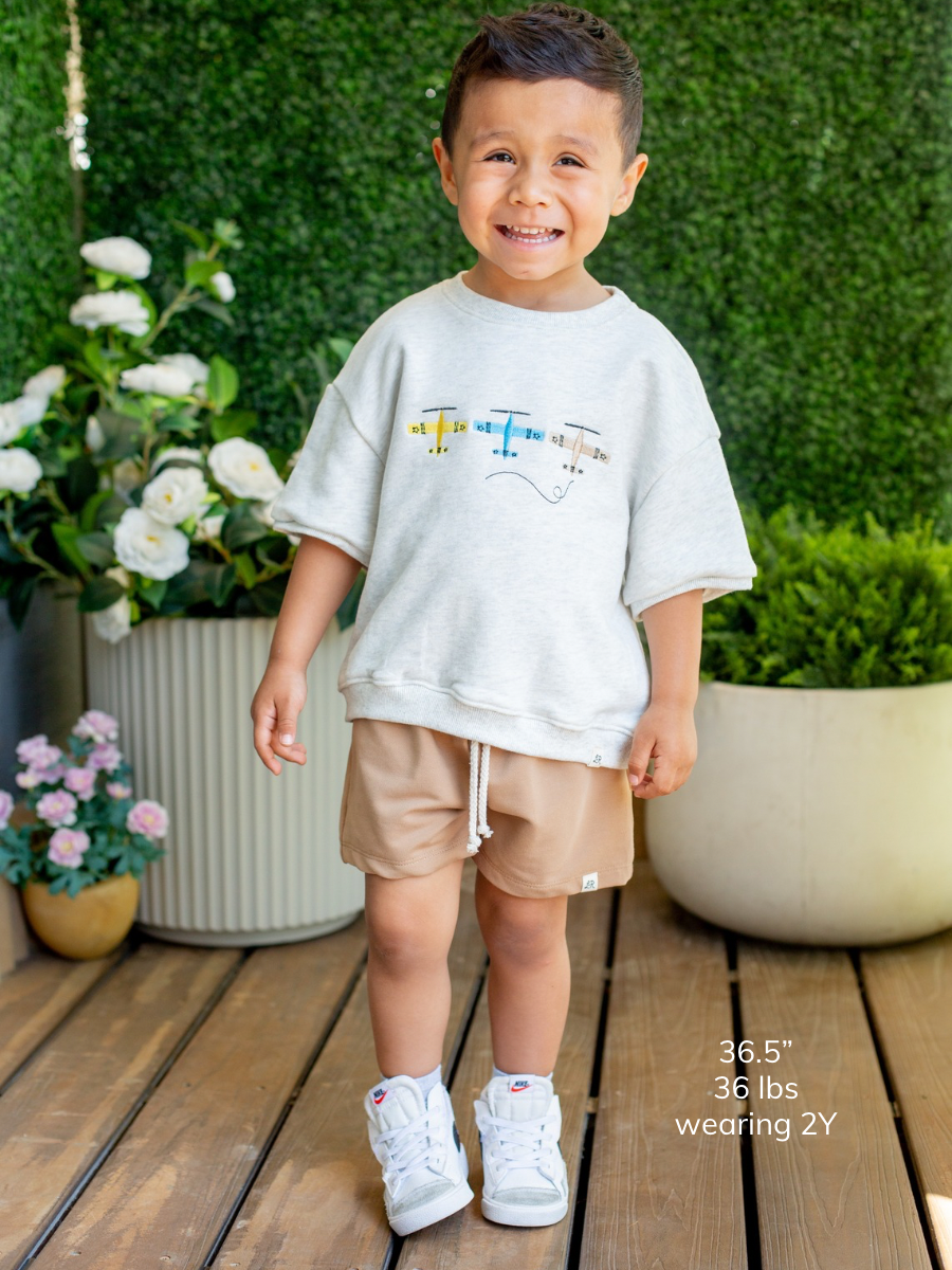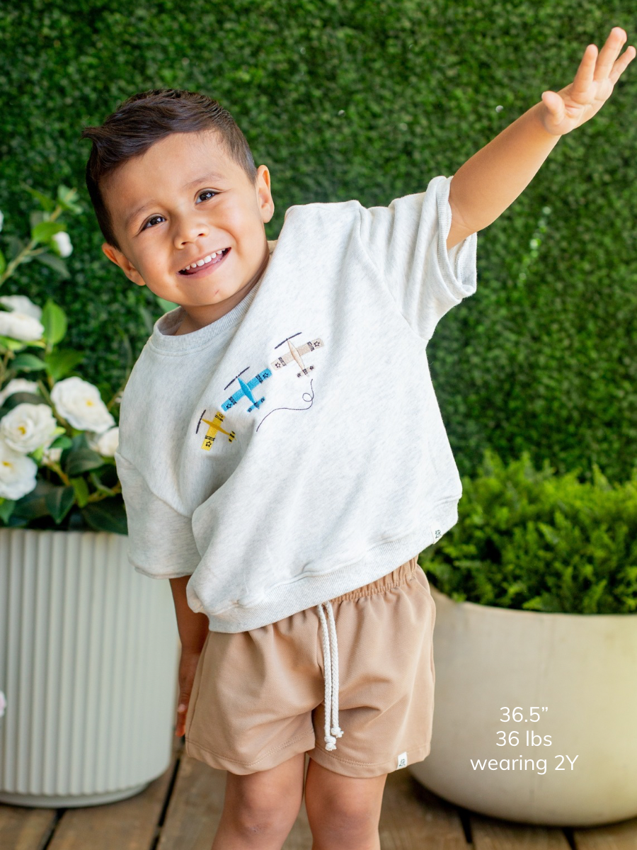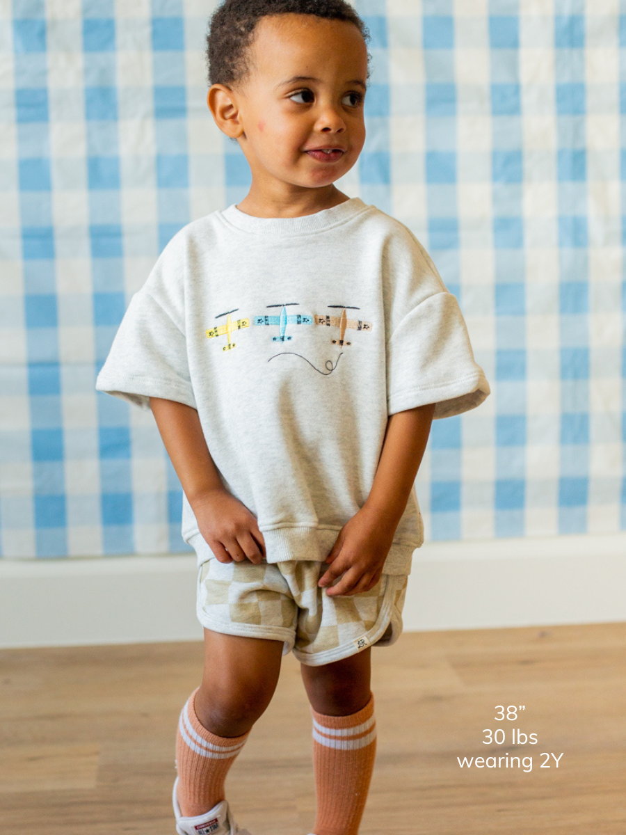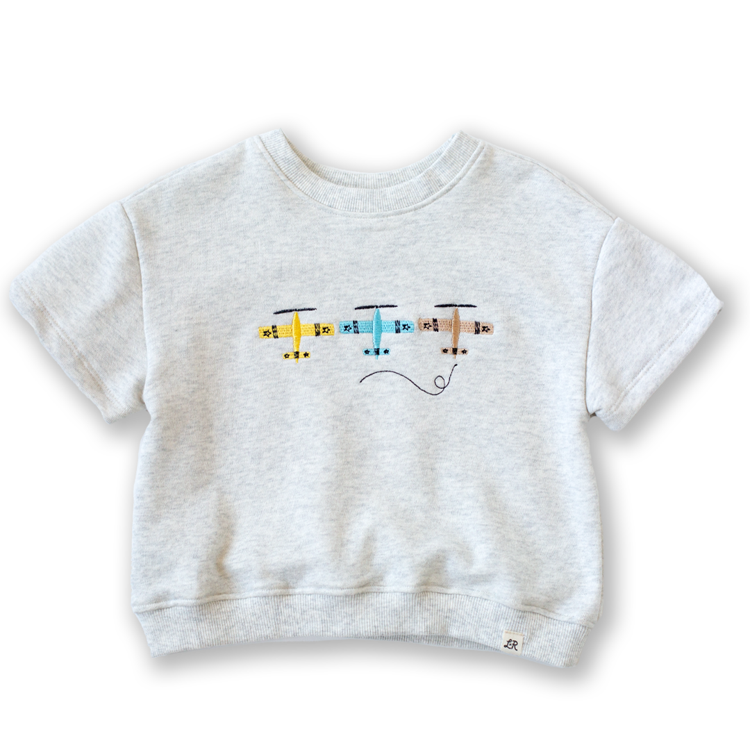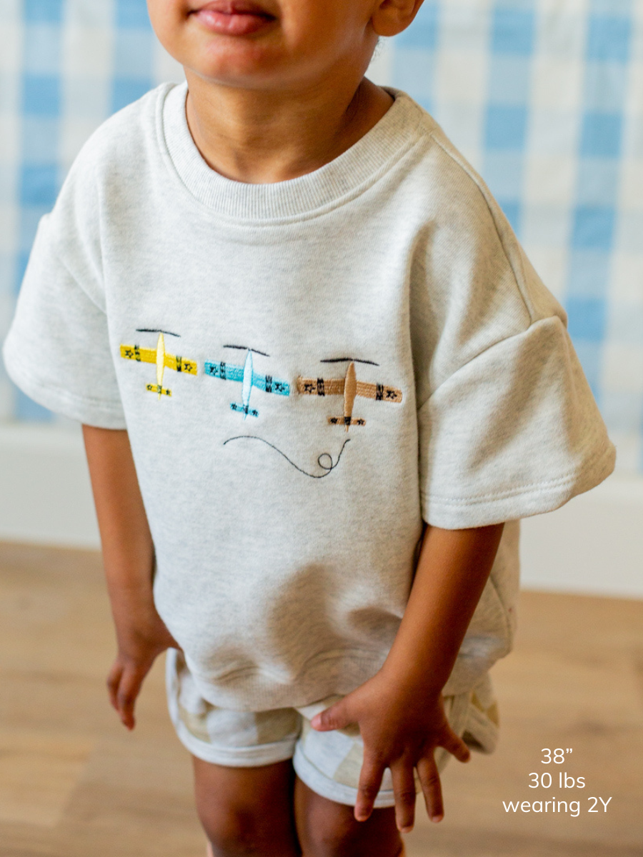Embroidered Airplane Short Sleeve Drop Shoulder Crewneck