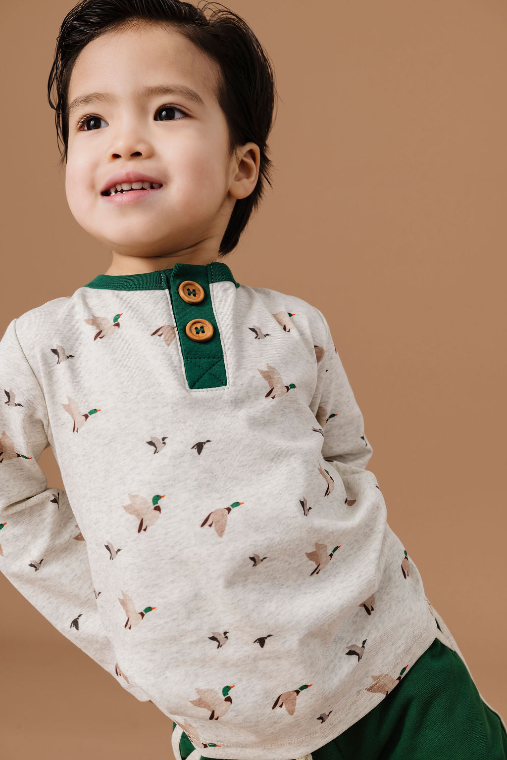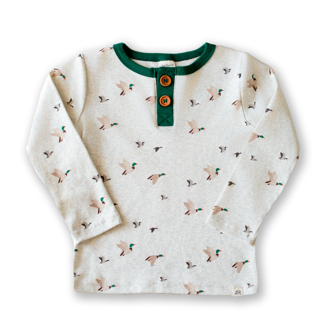 Introducing the Mallard Print Long Sleeve Button Shirt—a versatile staple designed to coordinate seamlessly with the entire Little Road Co. collection. Crafted from a medium-weight rib knit blend of 95% cotton and 5% spandex, this shirt delivers comfort and durability for active play. The fabric offers natural stretch and breathability, though it is not pre-shrunk; we recommend air-drying or accounting for up to 10% shrinkage if machine-dried. Mix and match the coordinated colorways throughout our line to build a cohesive wardrobe. Made in China.